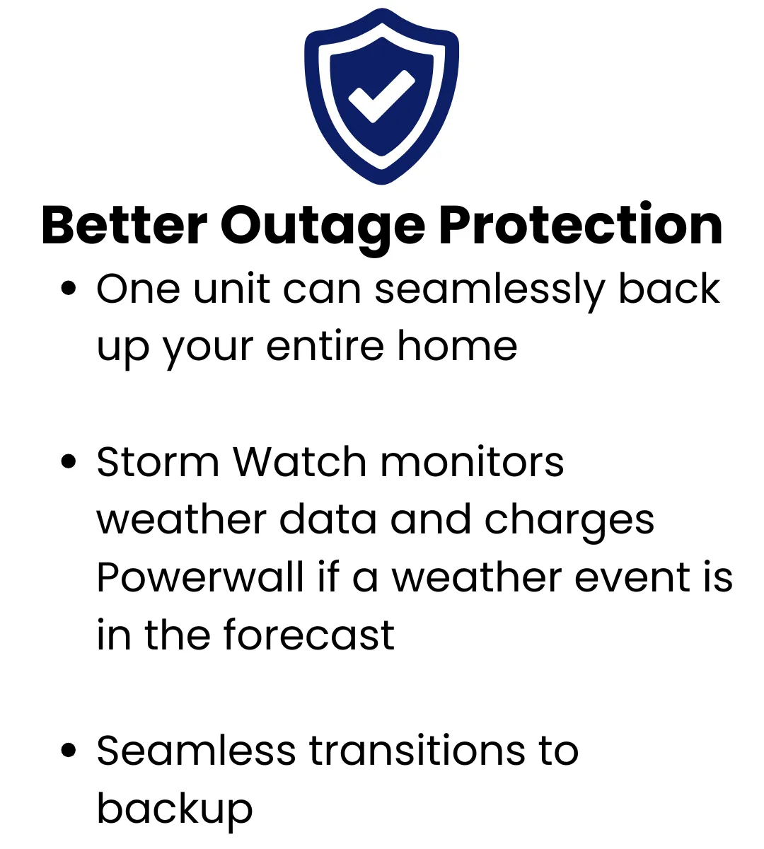 The Tesla Powerwall is a rechargeable home battery that stores excess energy for use in the evening or during outages, giving you 24/7 backup protection and energy savings.
